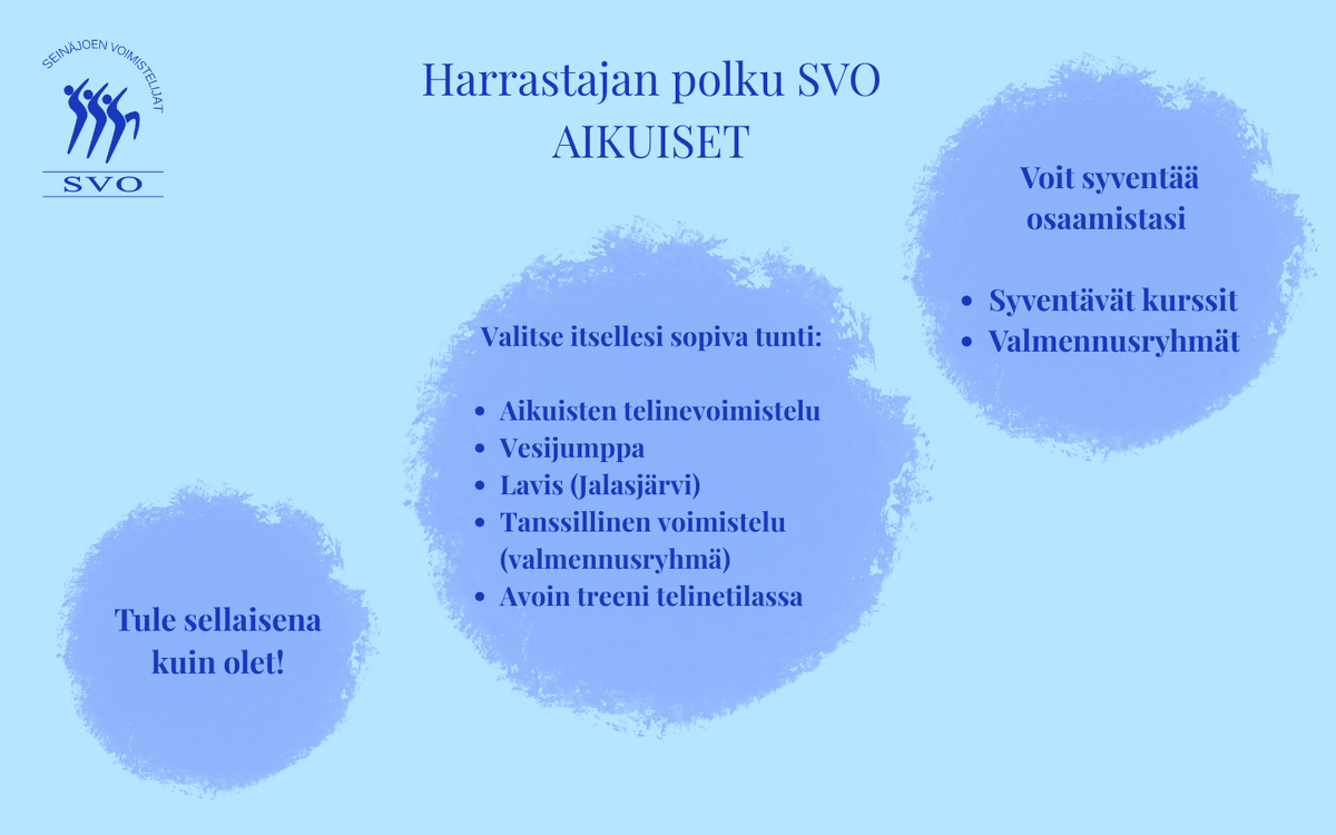 Seinäjoen Voimistelijat tarjoavat aikuisille laadukasta harrastustoimintaa. Aikuisten harrasteliikunta tarjoaa mahdollisuuden liikkua rennossa ja kannustavassa ilmapiirissä omalla tasolla ja omista lähtökohdista käsin. Ryhmät sopivat niin vasta-alkajille kuin liikuntaa jo harrastaneille, eikä aiempaa voimistelu- tai liikuntataustaa tarvita.